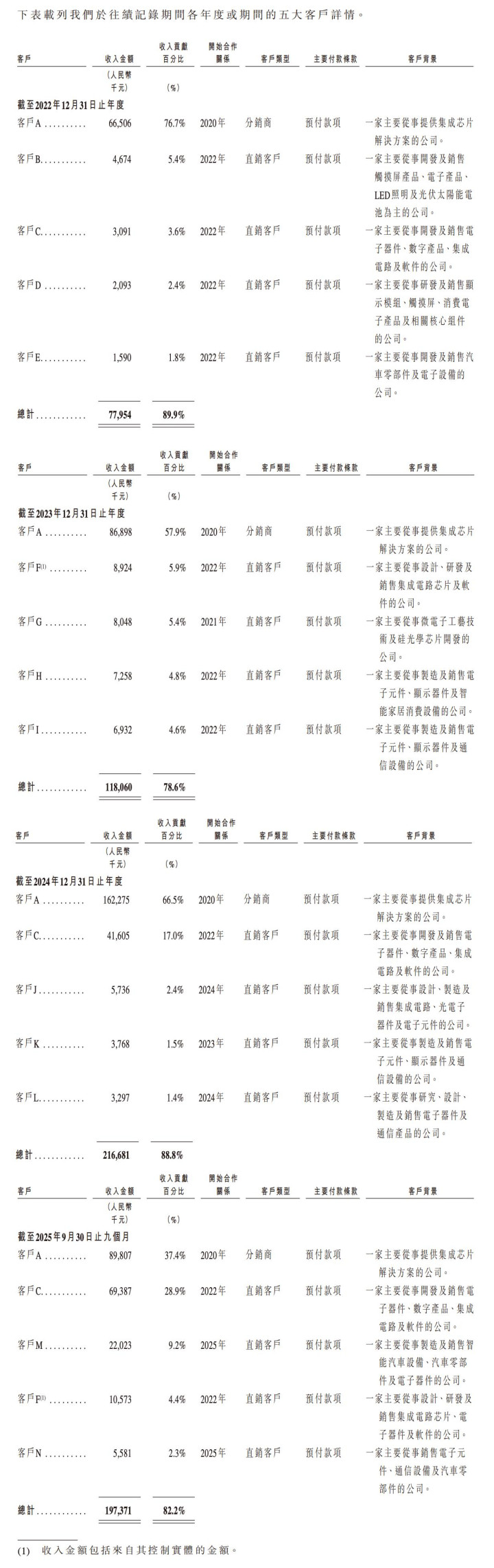 曦华科技提供的主要产品为智能显示芯片。2022年至2025年前9个月,曦华科技来自前五大客户的收入占总收入的89.9%、78.6%、88.8%、82.2%,其中来自最大客户的收入占总收入比重为76.7%、57.9%、66.5%、37.4%。