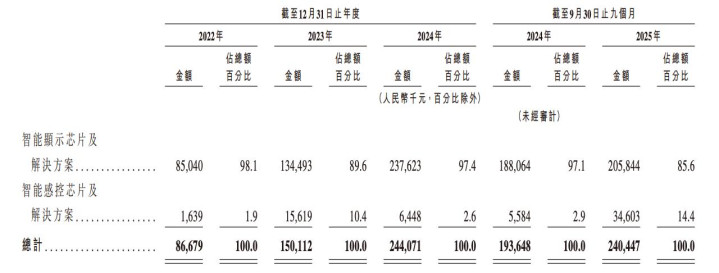 智能显示芯片及解决方案是曦华科技的主要营收来源,2022年至2025年前9个月营收占比都超过85%,智能感控芯片及解决方案的营收占比从2022年的1.9%,增长至2025年前9个月的14.4%。