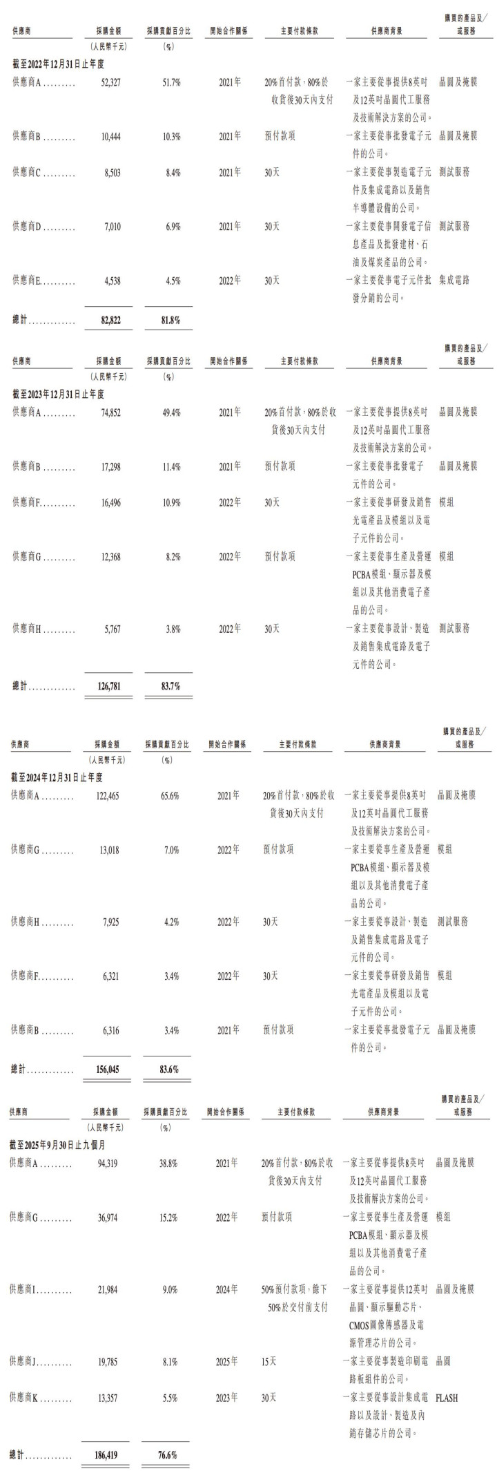 其供应商主要包括晶圆代工厂、封装及测试服务提供商。2022年至2025年前9个月,曦华科技向前五大供应商的采购额分别占采购总额的81.8%、83.7%、83.6%及76.6%,最大供应商的采购额占比为51.7%、49.4%、65.6%、38.8%。