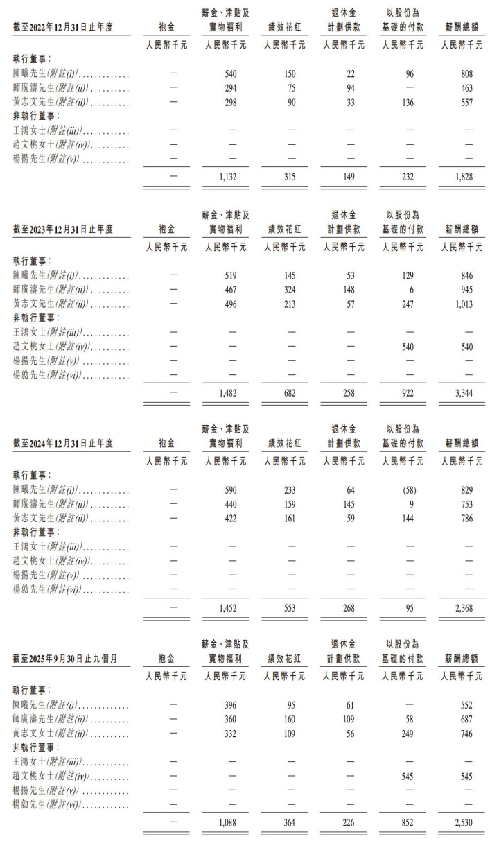 梁运星、黄辉、刘志翔于2025年5月被委任为独立非执行董事,统计时间内无应付薪酬。王鸿、杨扬、杨勍于今年10月底辞任非执行董事。