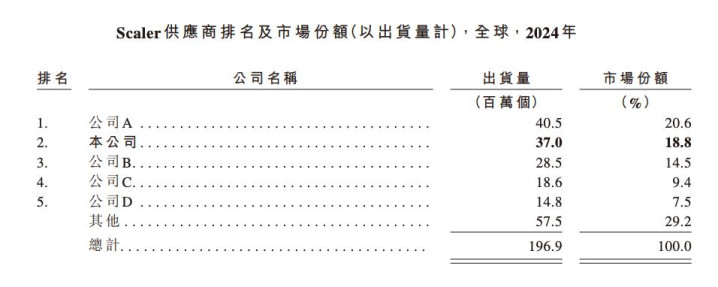 沙利文数据显示,2024年,全球Scaler市场中前五大供应商合计市场份额达70.8%,曦华科技凭借3700万颗的出货量排名全球第二,市场份额为18.8%。根据批注估计,公司A为莱迪思半导体、公司B为京微齐力、公司C为安路科技、公司D为荣晶电子。