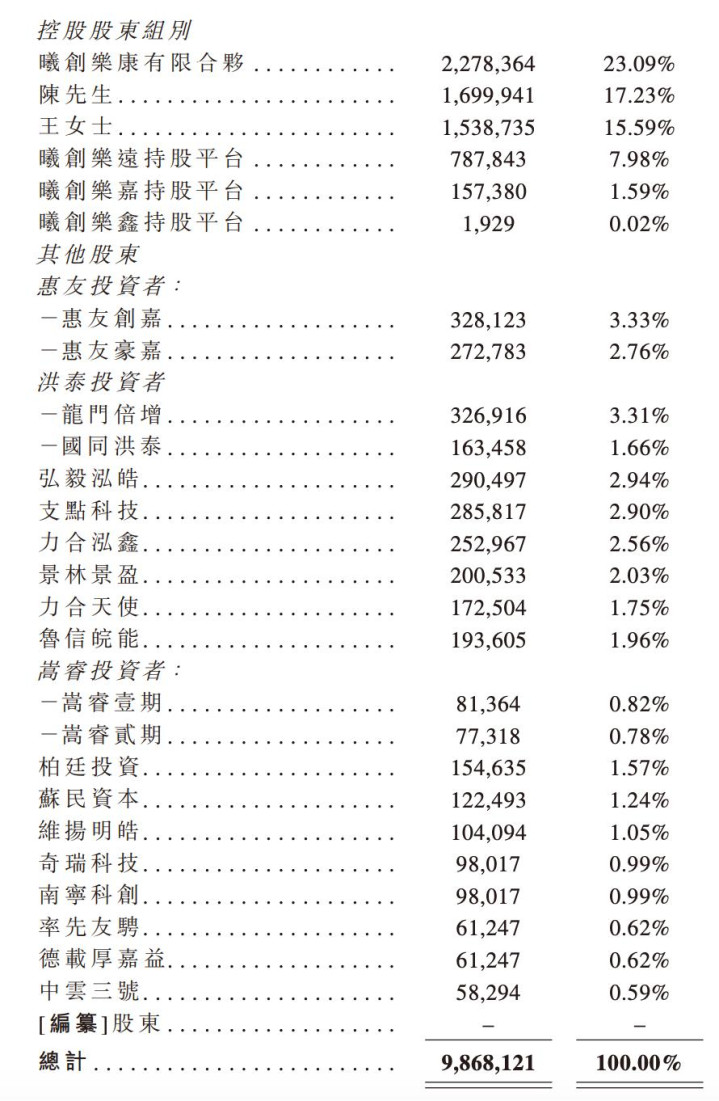 曦华科技创始人、董事长陈曦直接持股17.23%,陈曦配偶王鸿直接持股15.59%,曦创乐康有限合伙、曦创乐远持股平台、曦创乐嘉持股平台、曦创乐鑫持股平台分别持股23.09%、7.98%、1.59%及0.02%。